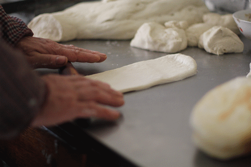 逛西安的肉夹馍老店,基本上每家都会雇专门的师傅做白吉馍,也叫“打馍”。师傅一手持面,一手持擀面杖,反复捶打敲击。熟练的师傅一天可以打好几百个馍,模样大小所差无几,放进身侧的平底锅中,先烙后烤,火候对了,才能出好饼。