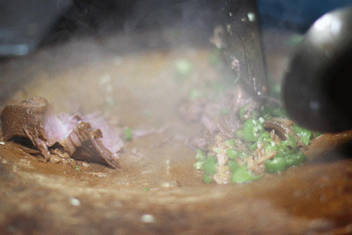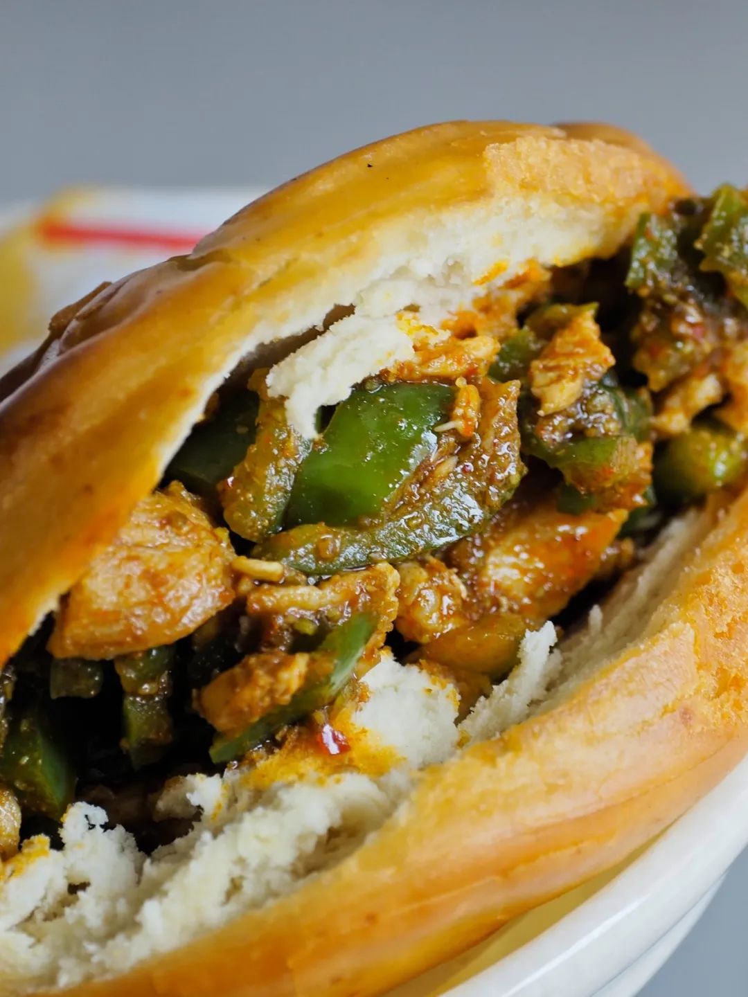 孜然肉夹馍,是油炸白吉饼夹青椒炒鸡胸肉。