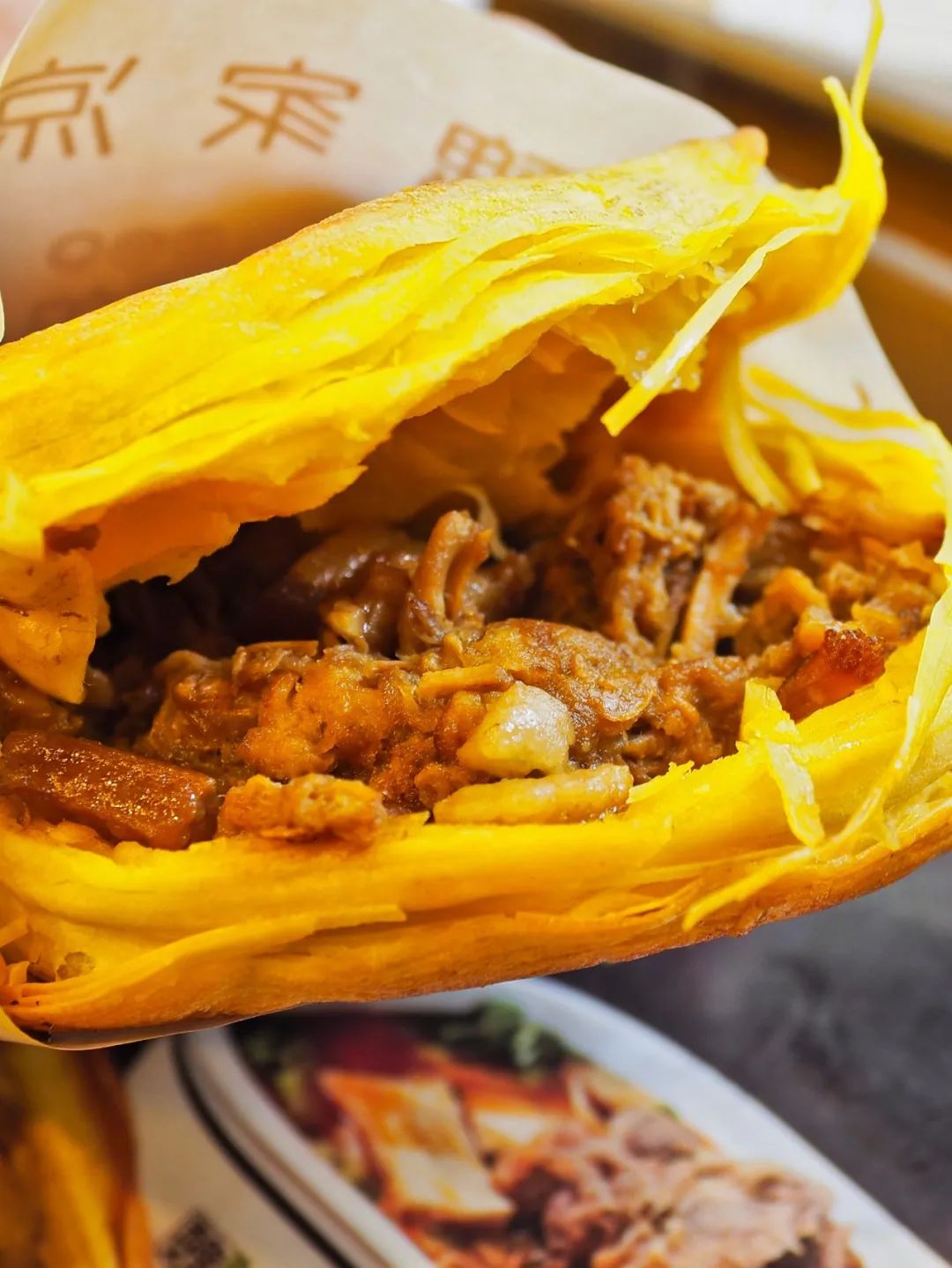 肉夹馍里的馍主要分两大派,西安派的白吉馍,和潼关派的油酥千层馍。肉夹馍之“馍”放到了末尾,并不是说馍就能瞎糊弄了,相反,原本的主食馍馍听上去变成了“压轴菜”,在“馍省人”眼里更是马虎不得。