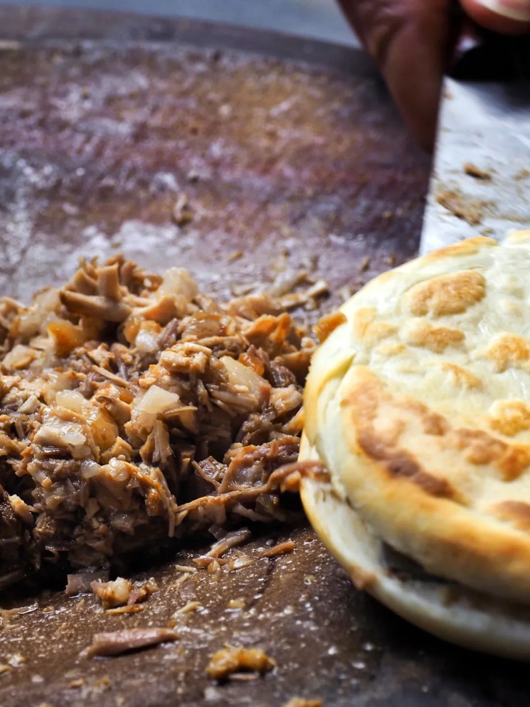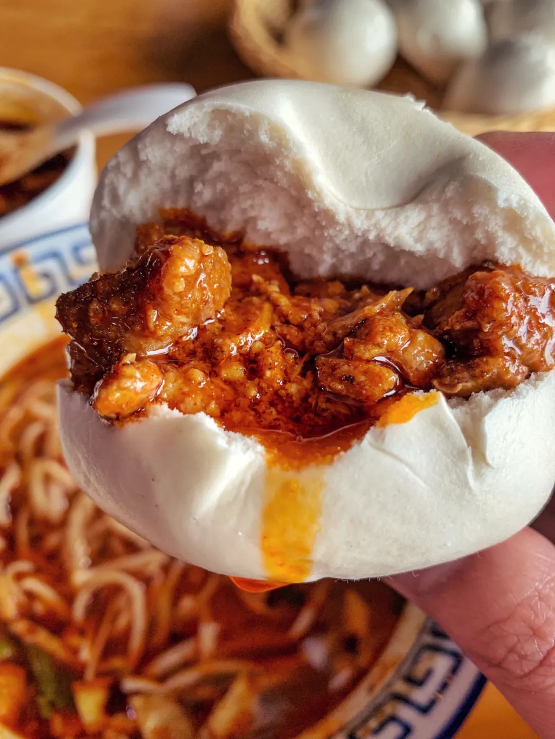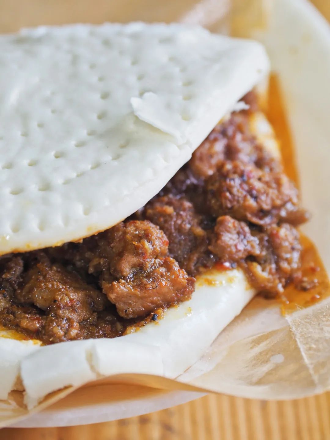 宝鸡岐山,臊子面的“圣地”,红油肉臊子不仅用来“咥面”,还被拿来夹馍。臊子肉夹馍除了用白吉馍,还可以用热蒸馍,不过最特别的还是红油肉臊子,加点岐山香醋,少了些油腻,多了几分咸香酸辣。夏天搭配臊子面,冬天搭配炒面皮,吃的是心满意足。
