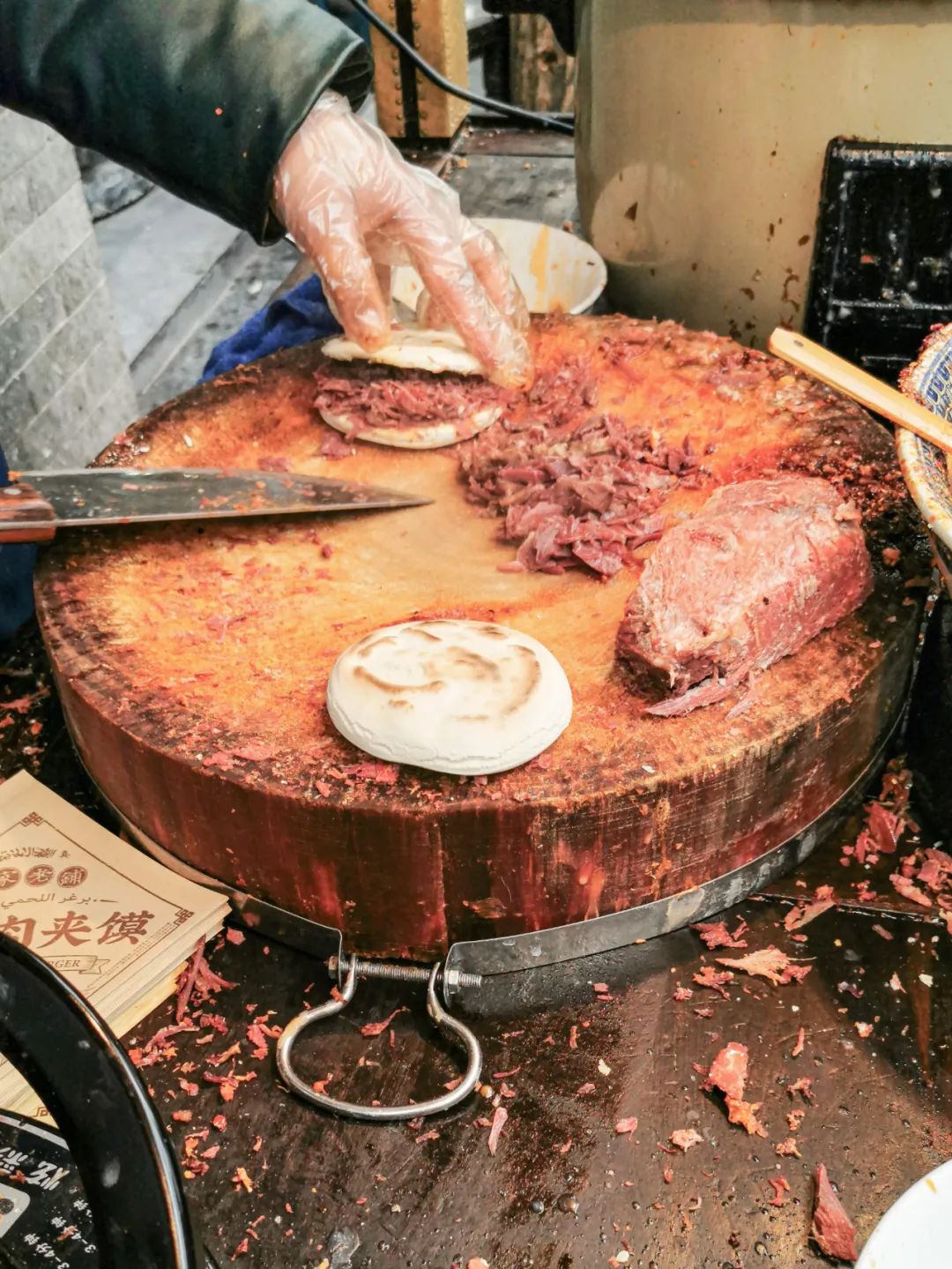 一张馍,划开两层皮,裹满汁水的肉剁碎抹进去,夹出了地道的陕西小吃——肉夹馍。