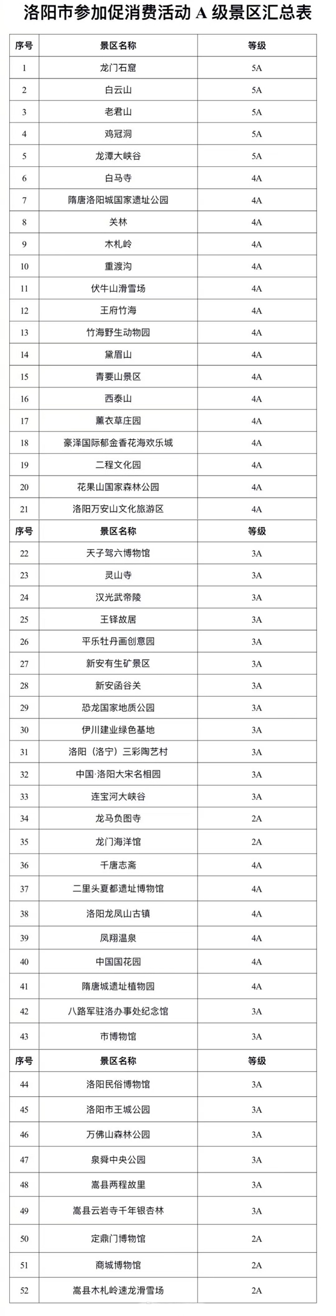 人民网洛阳12月28日电(辛静)12月28日,洛阳市举办“古都新生活 千企万品亿元”新春系列促消费活动新闻发布会,本网从发布会上了解到,2023年1月1日至31日,洛阳市将开展为期一个月的旅游景区免门票促消费活动,其中5A景区5家,4A景区22家,3A景区20家。免门票活动每天限量4万张,需提前线上预约。
