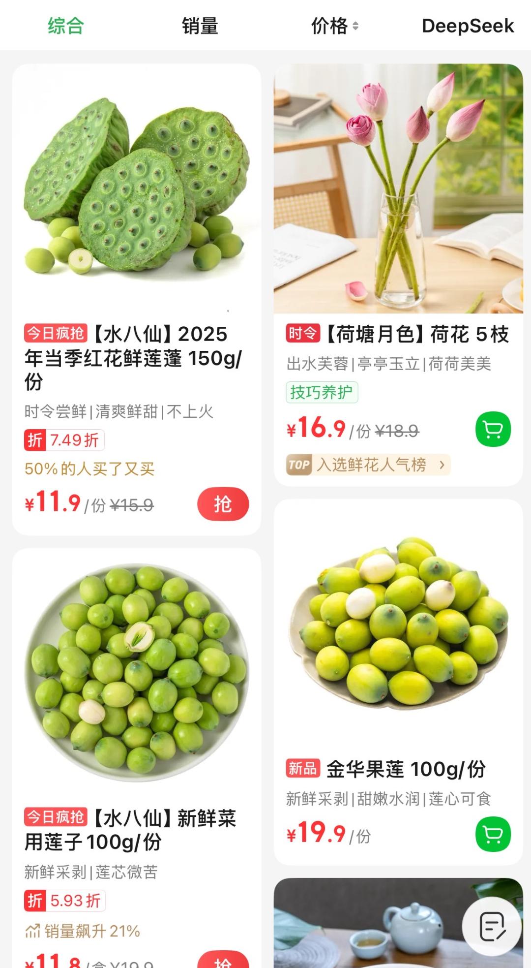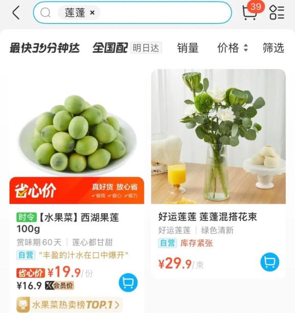 除了东山弄市集,不少商场和水果店里都开始上架莲蓬了!在某电商平台上,剥好的莲子按份售卖,每100g卖19.9元;另一家电商平台上,“水八仙”只卖11.9元/150克。有意思的是,除了莲子,平台上也开始售卖荷花、莲蓬混搭花束,近一个月人气也很高。