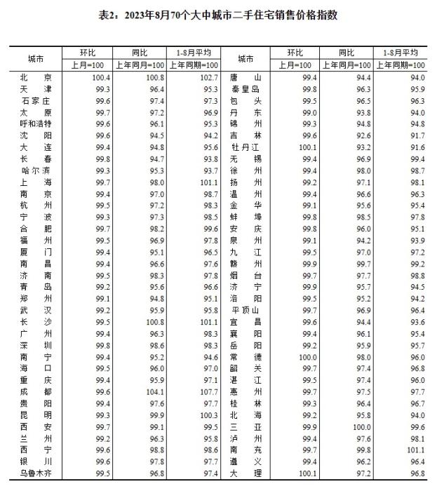 2023年8月70个大中城市二手住宅销售价格指数。 截图自国家统计局官网