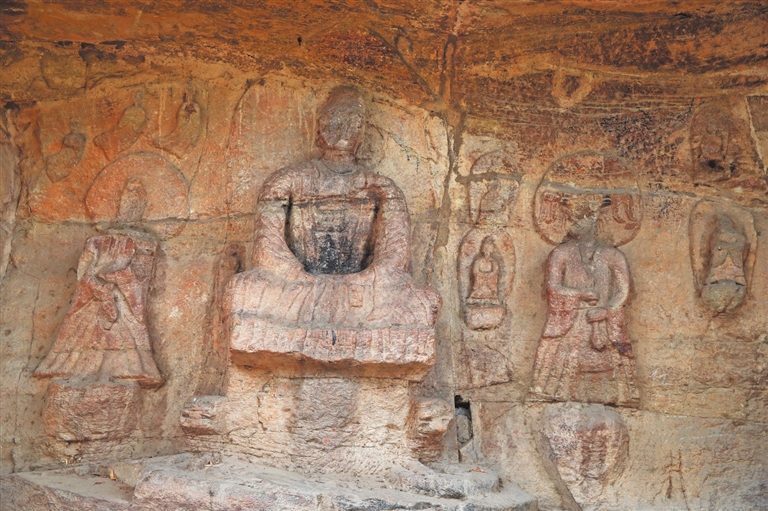 铺沟石窟刻凿在灰色粗砂岩的岩壁上。