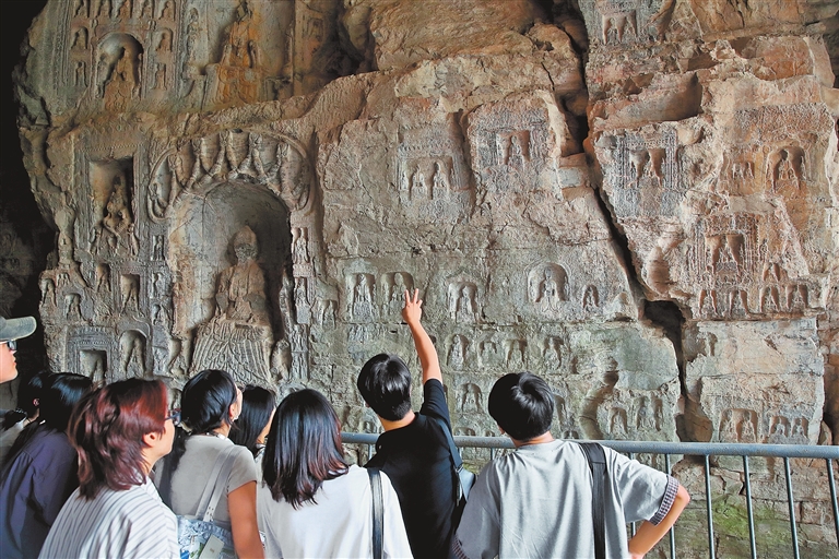 7月16日,来自安徽的游客在水泉石窟内参观。