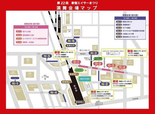 「第22回新宿エイサーまつり」の開催日時は7月26日(土)12:00~19:00で、小雨決行。場所は新宿駅東口/西口一帯だ。