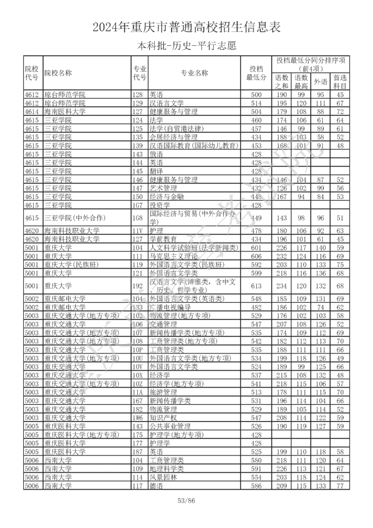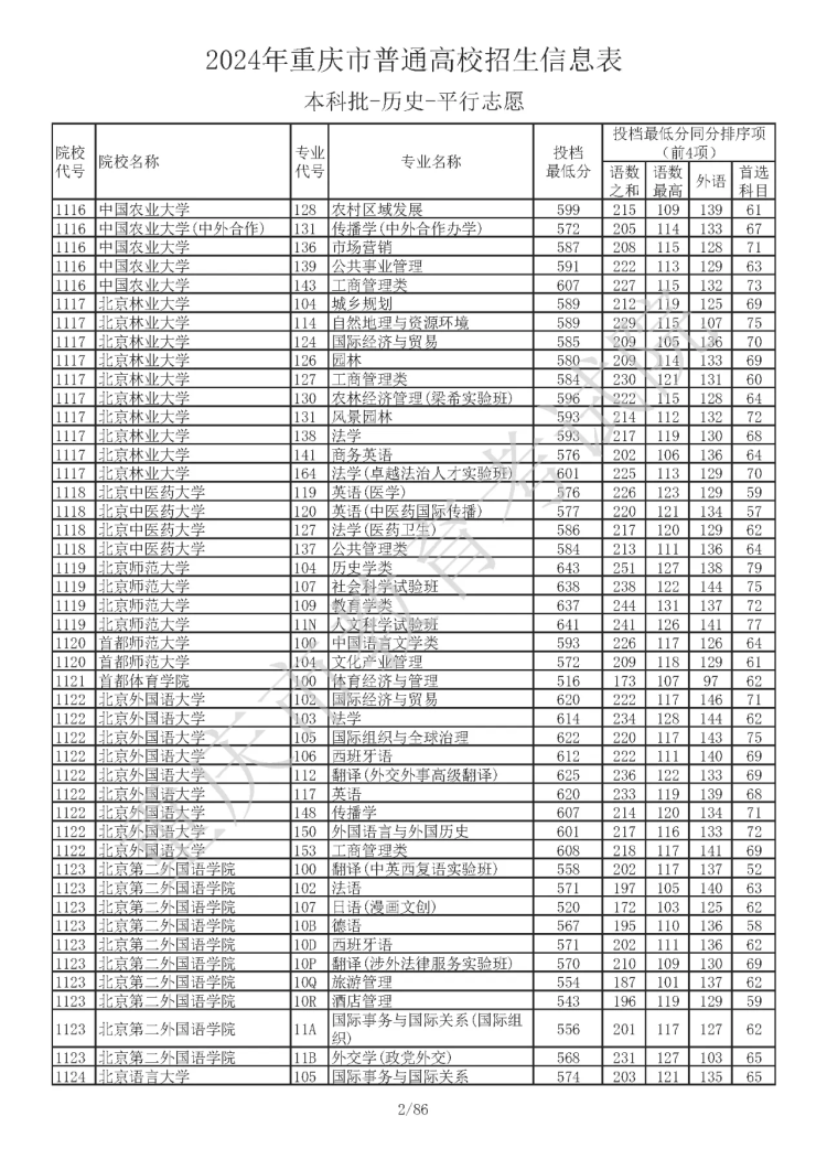 历史类重庆大学外国语言文学类(民族班)投档分数最低为592分。西南大学投档最低分为园林专业552分。