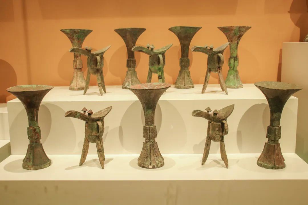 除了这尊大方鼎,博物馆还展示了妇好墓出土的数十套铜觚、铜爵,以及大量青铜兵器。说明她不仅是一位高级祭司,也是一位战功赫赫的女将军。