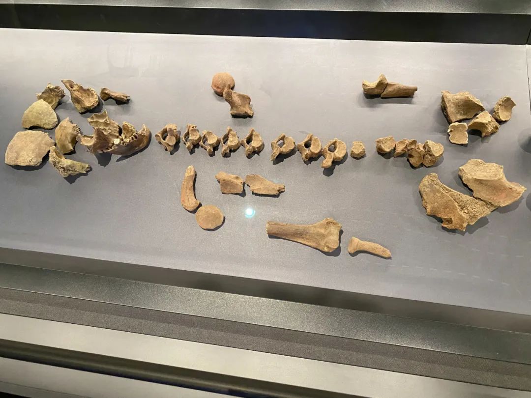 亚长的骨骸也得到了展示。骨骸出土时仅存部分颅骨、四肢骨。根据骨骼特征判断,这是一名身高约170厘米、年龄35岁左右的中年男性,骨骼上有七处创伤,是致死的主因。