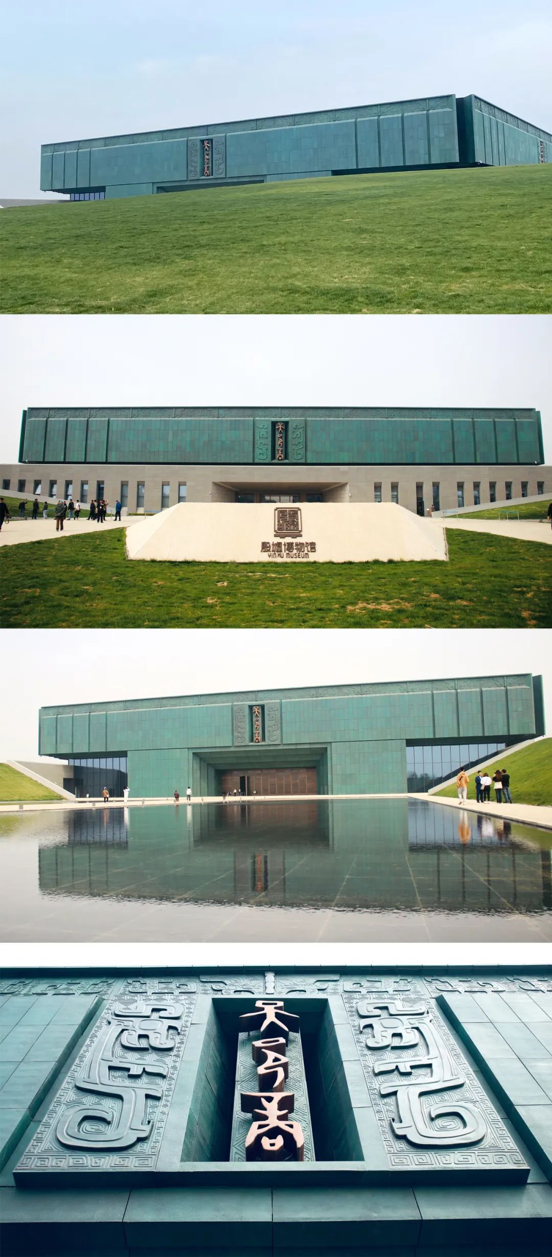 新馆建筑可谓高端大气上档次,鼎形建筑矗立在青草台地上,倒映在水中,外立面为青铜色的幕墙,饰有青铜器纹饰,大门上方有三个甲骨文“大邑商”。建筑整体古朴而庄重。
