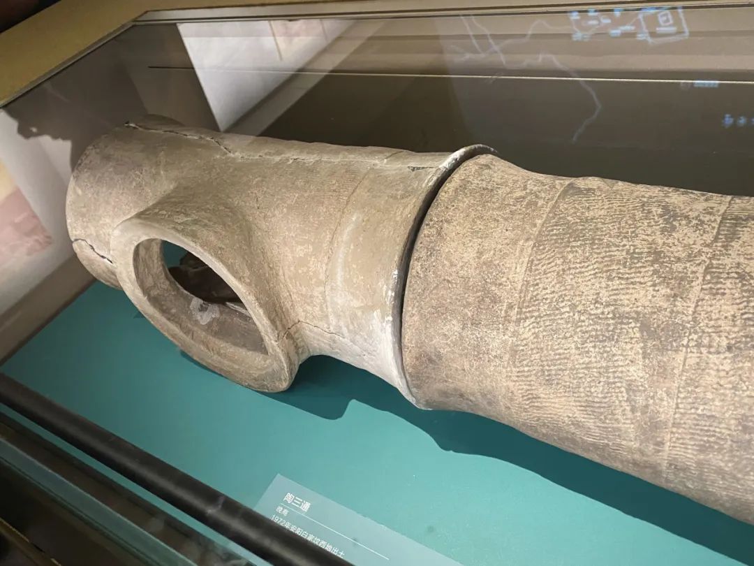 博物馆还展示大量陶器,其中,一件体量巨大、形状奇怪的器物引起了我的注意。这个物件叫做“陶三通”,是管道的联结器,它证实了大邑商已有发达的地下排水系统。