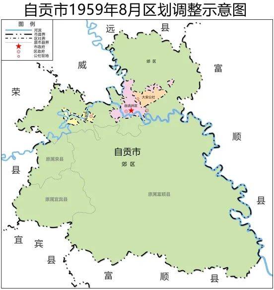 1959年,富顺、宜宾、荣县3个县约460平方公里区域划归自贡市,使自贡市辖区面积大幅扩张,至1978年荣县划归自贡市前的近20年,为自贡市区划演变的第三阶段。辖境面积远超原辖境的大范围扩张,是该阶段自贡市区划演变最显著的特征,这为后续自贡市的持续扩大奠定了政区基础。本文将介绍自贡市第三阶段——扩展初期的行政区划与辖境情况。