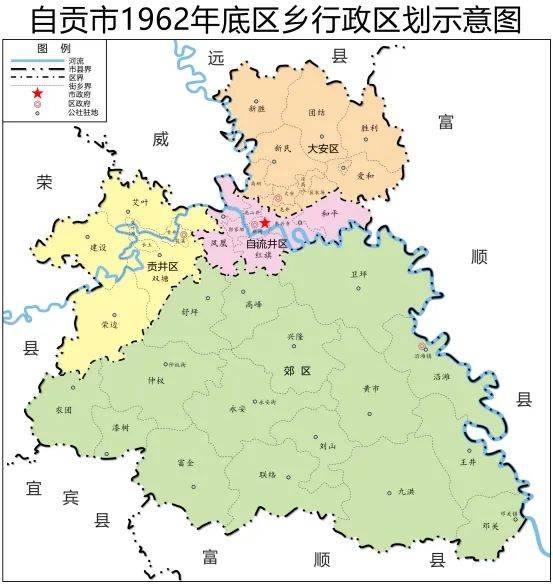 其中,富顺县划入区域即今沿滩区沿滩镇(不含釜溪河以东区域)、王井镇、九洪乡、黄市镇、兴隆镇、永安镇、联络镇、富全镇、卫坪街道(含板仓街道)、邓关街道,自流井区高峰街道、舒坪街道及红旗街道南部、仲权镇东部,大安区和平街道樊家坝;宜宾县划入区域即今自流井区飞龙峡镇和仲权镇西部;荣县划入区域即今自流井区荣边镇(不含新房村)。