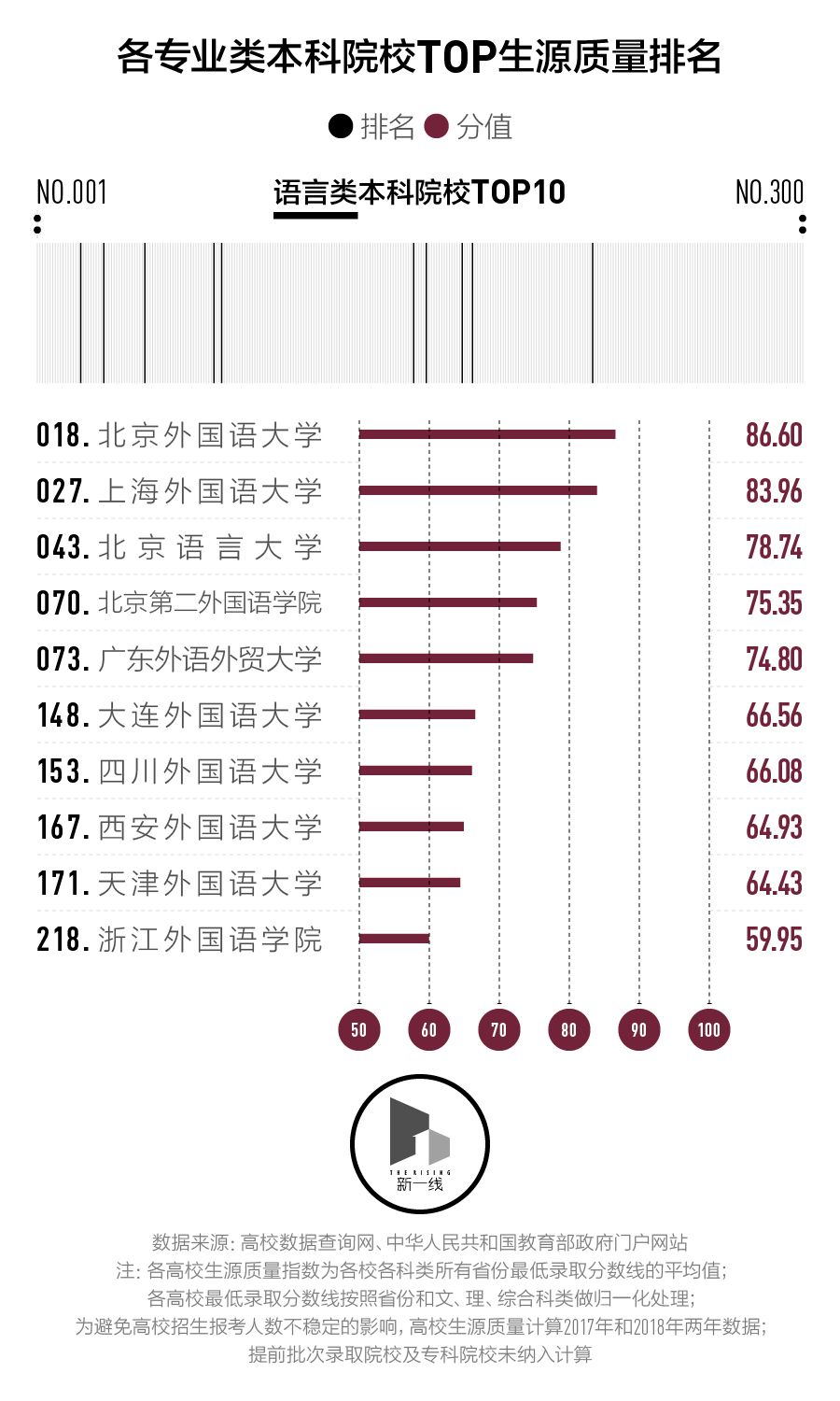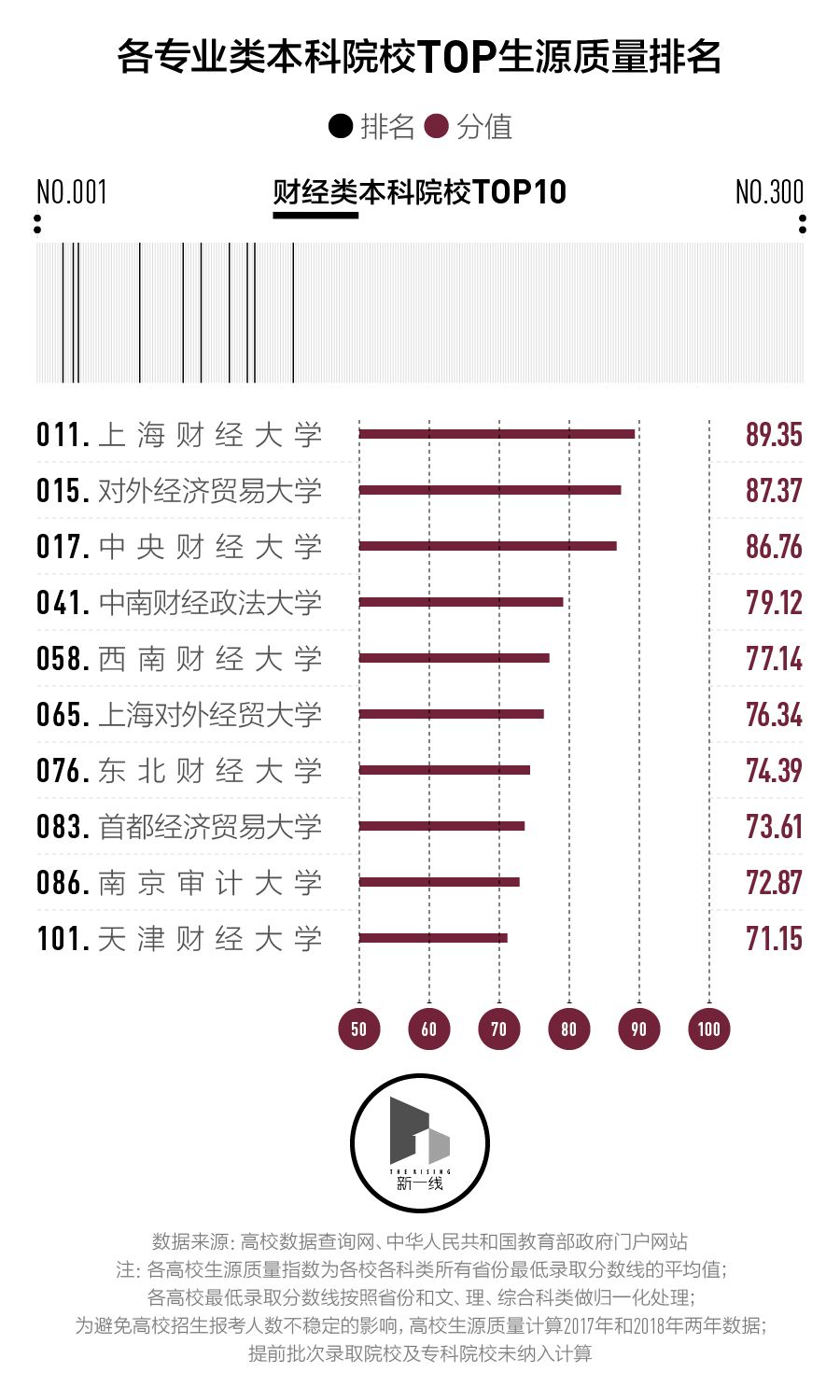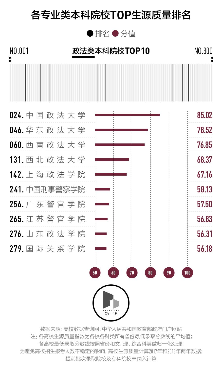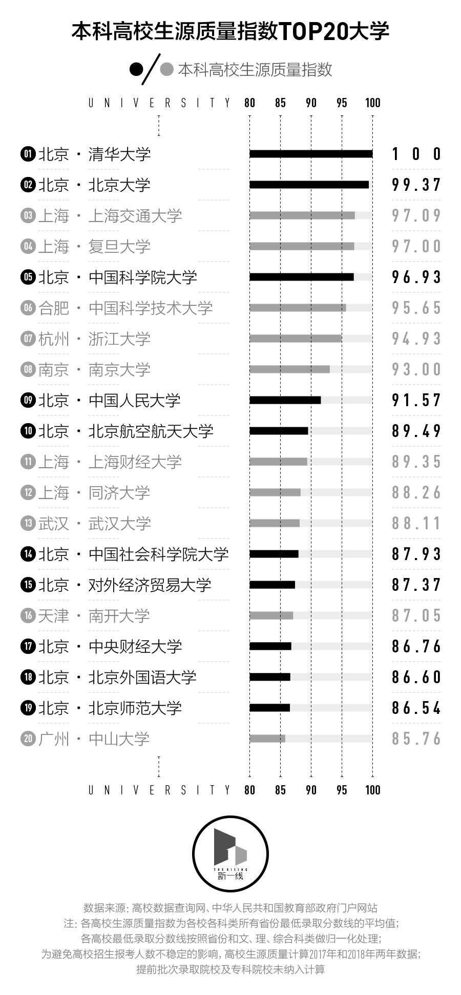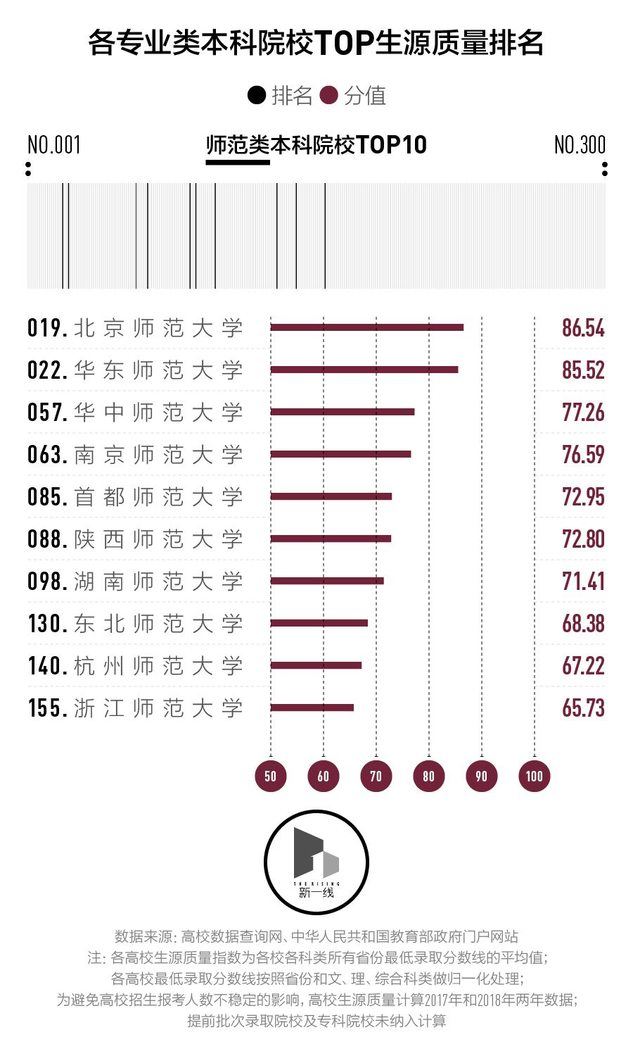 为了适当消除招生大小年的影响,我们同时计算了2017年及2018年的数据。另外,考虑到录取标准的差异,有70所只在提前批次录取的艺术类、体育类、政法警察类等特殊专业院校、国际合作院校及招收本科专业的职业院校未纳入计算。