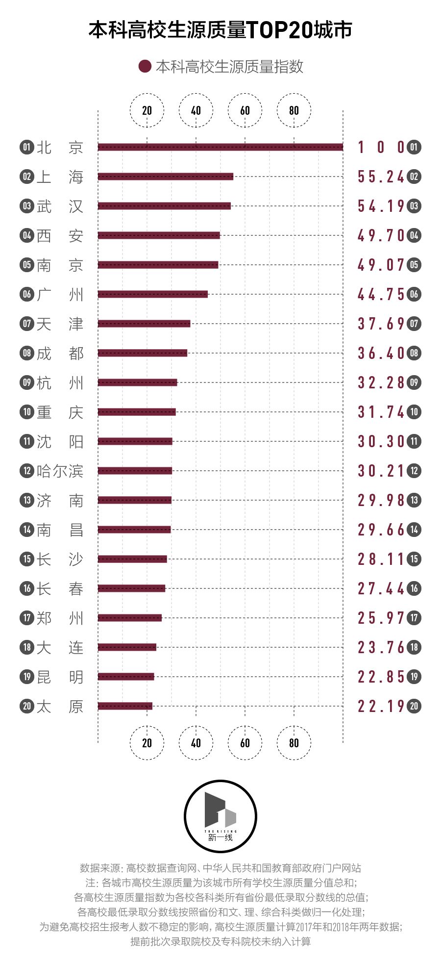 在选择去哪个学校上学的背后,也隐含着对城市的选择。“知城·本科高校生源质量指数”就是凭借高考录取分数线综合计算得出,它想要衡量的是哪些城市具备了强大的人才资源库?