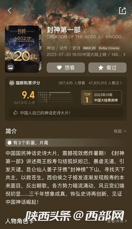 记者了解到,暑期档《封神第一部》于7月20日全国上映。作为封神IP新一部改编之作,该影片购票评分达9.4分,有60余万人参与影片讨论,位列2023年第31周中国大陆票房榜TOP1。