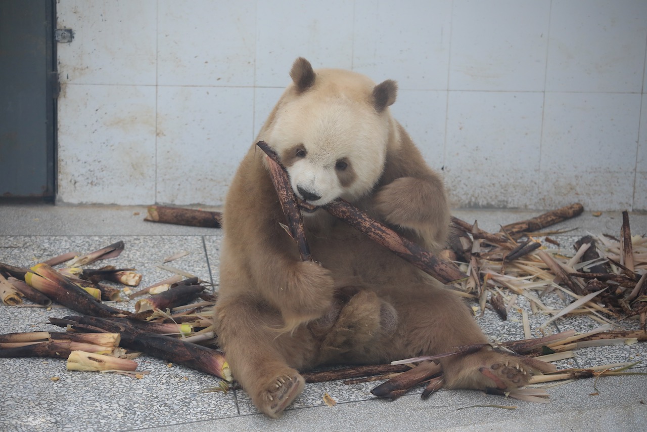 2021年6月19日,西安,棕色大熊猫“七仔”在秦岭四宝科学公园内一边玩耍一边吃竹笋。视觉中国 图