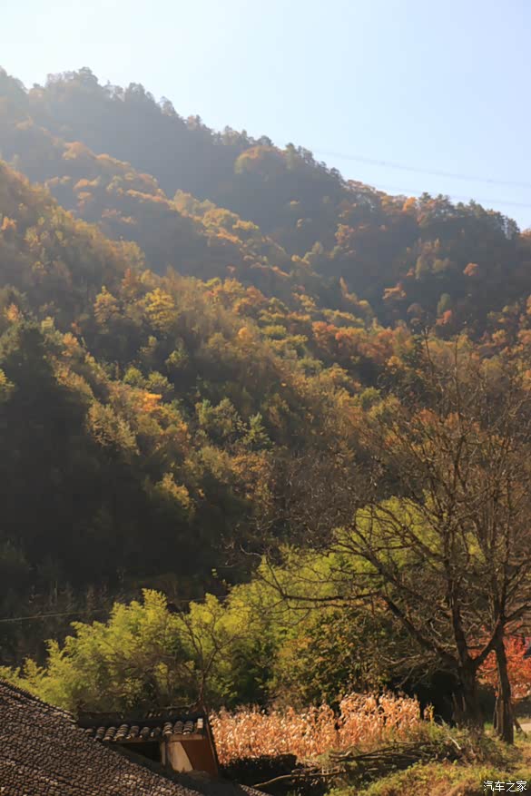 刚进到山里,已经有很多植被,颜色逐渐过渡到红色黄色了。沿着关池路一直走,沿路的景色也越来越好,站在山顶垭口,可以一览秦岭的秋景,山中峪口还有河流,公路也是顺着河边绵延向前,仿佛就是在山水画卷中穿行。