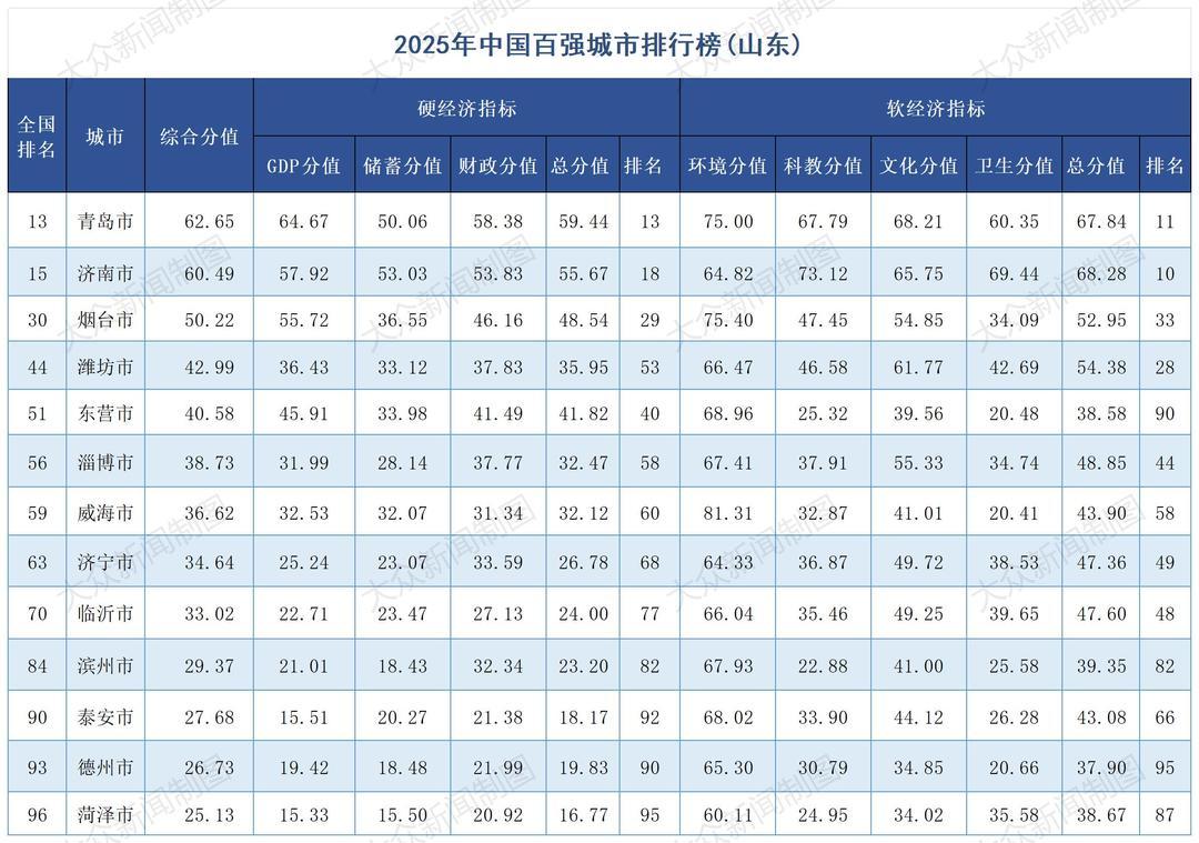 近日,华顿经济研究院在上海发布2025年中国百强城市排行榜,山东共有13个城市上榜,数量和江苏并列第一。