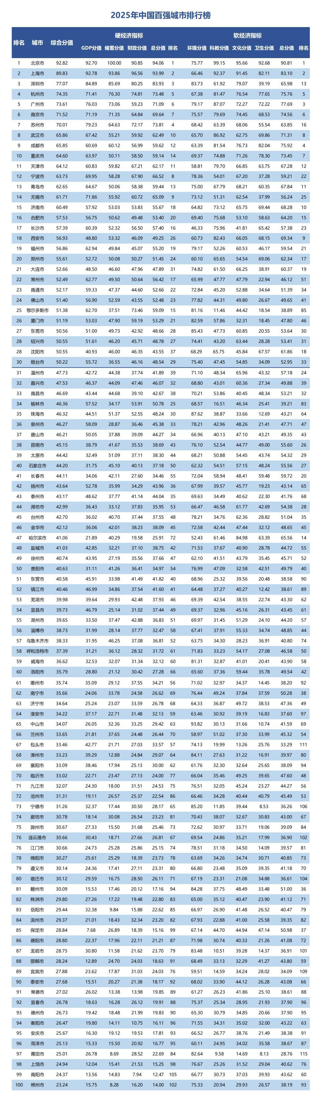 自2015年以来,华顿经济研究院连续第十一年组织编制年度“中国百强城市排行榜”。榜单以上年度GDP总量排名前115位的地级及以上城市作为年度入围城市,按照其硬经济指标(GDP、储蓄和财政)和软经济指标(环境、科教、文化和卫生)综合得分进行排序,取前100位作为年度百强城市。