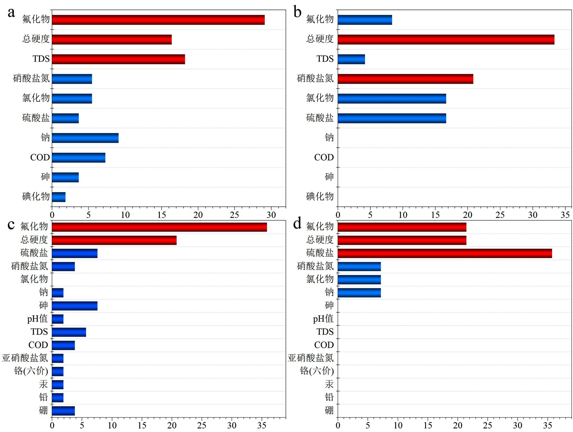 图6 张家口地下水超标指标贡献率:a和b分别为坝上高原Ⅳ类和V类水超标指标贡献率;c和d分别为坝下地区Ⅳ类和V类水超标指标贡献率