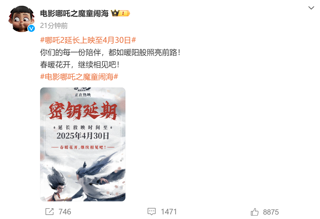 3月21日,电影哪吒之魔童闹海官方微博宣布,《哪吒2》延长上映至4月30日,“你们的每一份陪伴,都如暖阳般照亮前路!春暖花开,继续相见吧! ”此前2月19日,哪吒2曾宣布延长上映至3月30日。