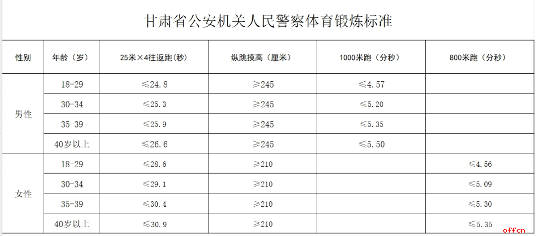 体能测评标准参照《甘肃省公安机关人民警察体育锻炼标准》(详见附件2)组织进行,内容为25米×4往返跑、纵跳摸高和男子1000米跑、女子800米跑3个项目。测评中,25米×4往返跑不超过2次,纵跳摸高不超过3次,考生有1次测评达标的,即视为该项目测评合格,男子1000米跑、女子800米跑只测评1次。体能测评的3个项目,凡其中一项不达标的,视为体能测评不合格,不得进入体检程序。