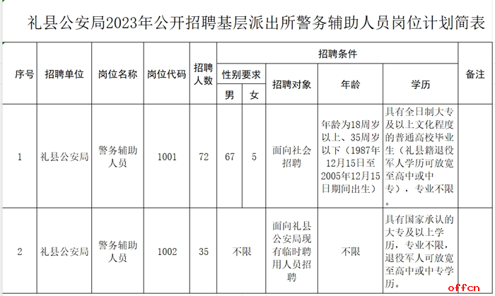 1.礼县公安局2023年公开招聘基层派出所警务辅助人员岗位计划简表