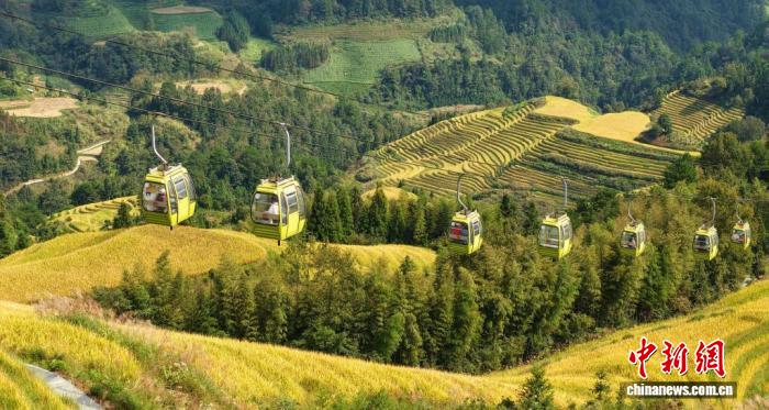 图为10月2日,在广西桂林市龙胜各族自治县龙脊镇大寨村,游客乘坐索道观光游览梯田。(无人机照片)潘志祥 摄