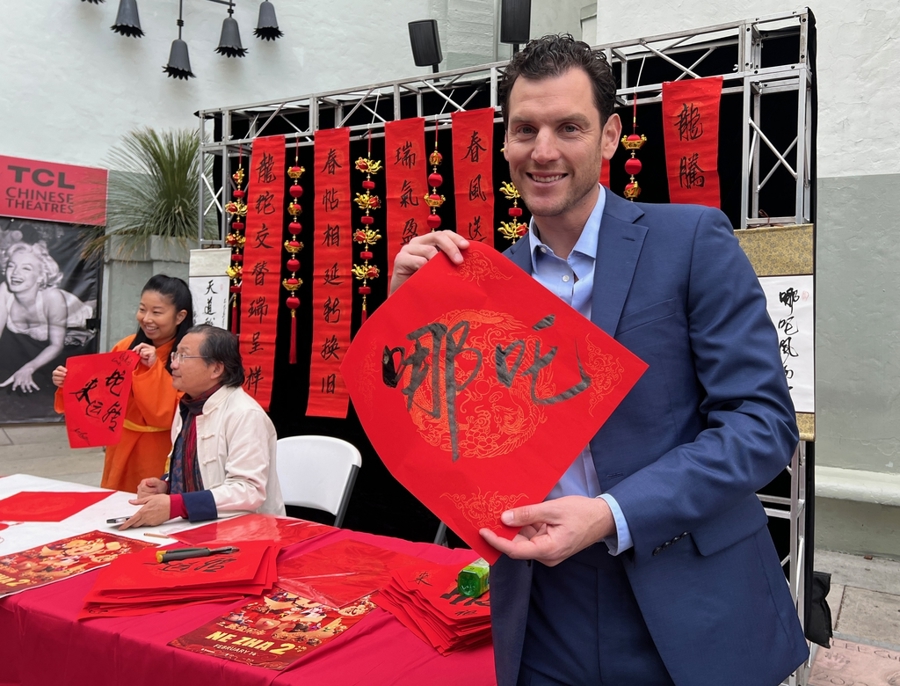 在与洛杉矶首映礼同时举办的“欢乐春节集市”上,前来观影的好莱坞电影演员杰西•莫拉莱斯(Jesse Morales)拿着写有“哪吒”的书法作品拍照留念。