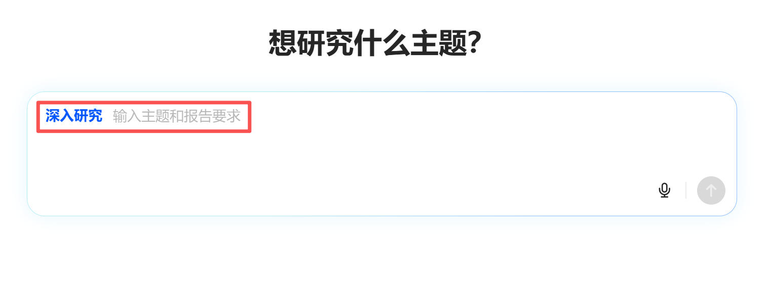 输入研究主题(如 “人工智能在医疗领域的应用”),可补充研究范围(如 “仅限中国市场”“2023-2024 年”)。