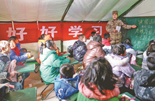 12月24日,甘肃省积石山县刘集乡阳洼村安置点,救援人员正在搭建活动板房。本报记者 陈 斌摄 12月23日,甘肃省积石山县刘集乡高李村安置点,孩子们在“武警爱民帐篷学校”上课。