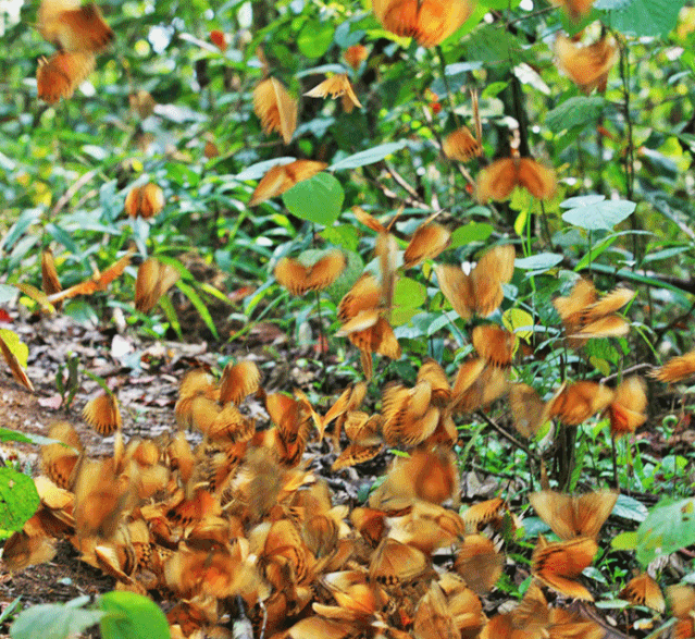 地面上的金黄色图案不见了,上百只箭环蝶骤然散开。夕阳柔和的光线下,纷飞的蝴蝶宛如漫天飞舞的花瓣,洒落在密林之间。