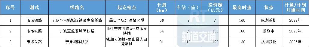 宁波至余姚城际铁路于2017年6月17日正式开通,由宁波市城际铁路发展有限公司运营。线路起于宁波站,止于余姚站,全长48.7千米,共设10座车站。采用8辆编组CRH6F城际动车组,最高时速160公里。