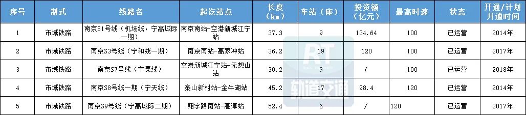 目前,南京已开通运营的市域(郊)铁路共计5条,分别为S1线(机场线)、S3线(宁和线)一期、S7线(宁溧线)、S8线(宁天线)、S9线(宁高城际)二期,由南京地铁运营有限责任公司负责运营管理。