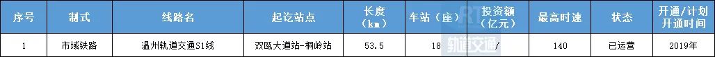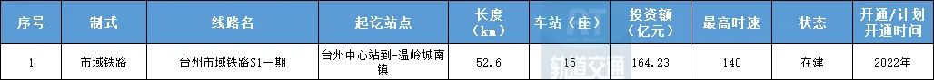 台州市域铁路S1一期于2016年11月17日开工,全长52.57千米,共设站点15个。自台州中心站至温岭城南镇,采用4节编组市域D型车,远期为6节编组,最高时速160公里。