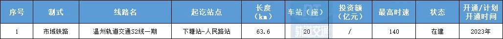 台州市郊铁路线路1全长62.2千米,自仙居南站经临海南站至台州站。采用2动2拖CRH6F-A型电力动车组,最高时速160公里。预计2021年开通运营。