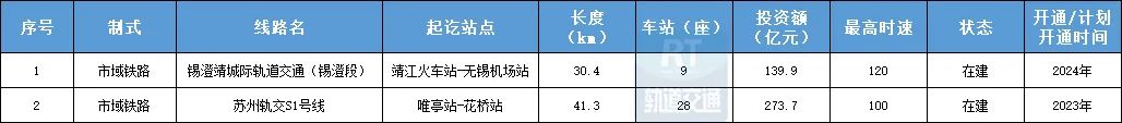 目前,江苏省其他城市在建线路2条,为锡澄靖城际轨道交通(锡澄段)、苏州轨交S1号线。