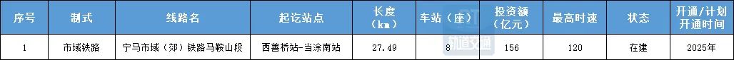宁马市域(郊)铁路马鞍山段于2020年12月30日开工。线路起自省界,终点至当涂南站,线路全长27.49km,共设8座车站。采用4节编组B型鼓形列车(远期6节),最高时速120公里。