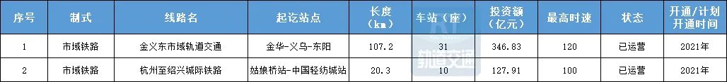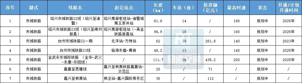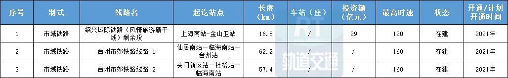 截至2021年7月,浙江省其他城市仅有1条市域(郊)铁路线路在建,为台州市域铁路S1一期。
