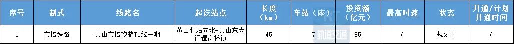 黄山市域旅游T1线一期自黄山北站向北至黄山东大门谭家桥镇,全长45千米,共设7座站点,预计投资85亿元。已被纳入长三角地区多层次轨道交通“十四五”规划建设项目表。