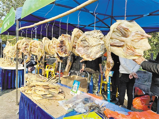在土特产展销区,腊鸭等成为“香饽饽”,吸引市民、游客前来购买。