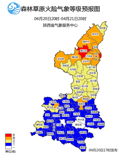 今日横山、吴堡森林火险气象等级为5级(极高危险),陕北其余地方为3~4级(较高-高度危险),请注意防范。