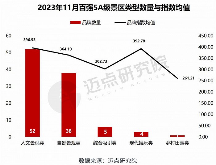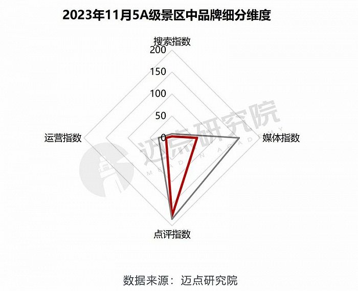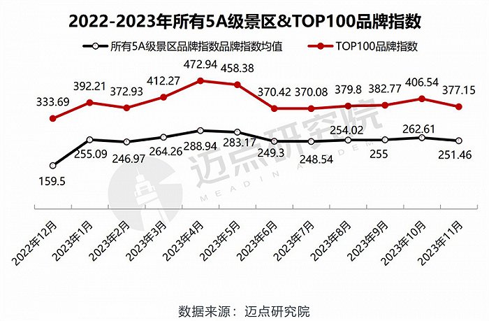 经迈点研究院监测,11月所有5A级景区的品牌指数均值为251.46,环比下降4.25%;100强5A级景区MBI品牌指数均值为377.15,环比下降7.23%。从两者数据来看,均呈现明显下滑现象,尤其是TOP100景区的指数均值。由此可知,非节假日冬季对于大众景区的发展具有显著影响,各景区应因势利导,有效宣推发展自有景区的冬季旅游产品。