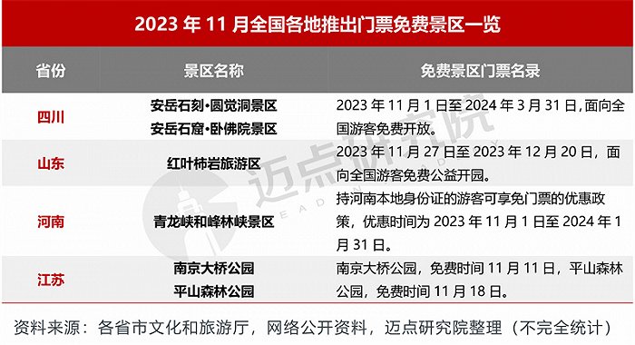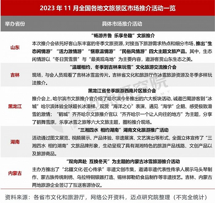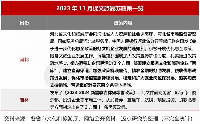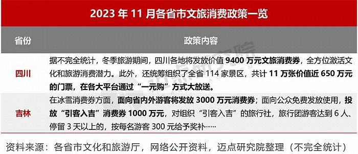 11月冬季旅游市场呈现火爆态势,各地纷纷出台相关文旅政策,开展助力工作。吉林省为深入贯彻“冰天雪地也是金山银山”的重要批示指示精神,推进国内冬季冰雪旅游大市场的繁荣发展,发布了《2023-2024新雪季吉林省冰雪政策》,其中包含了多项消费券福利,为实现“引客入吉”做了充分的准备工作。四川省为全方位激发冬季旅客的消费潜力,发放总计9400万元的文旅消费券。