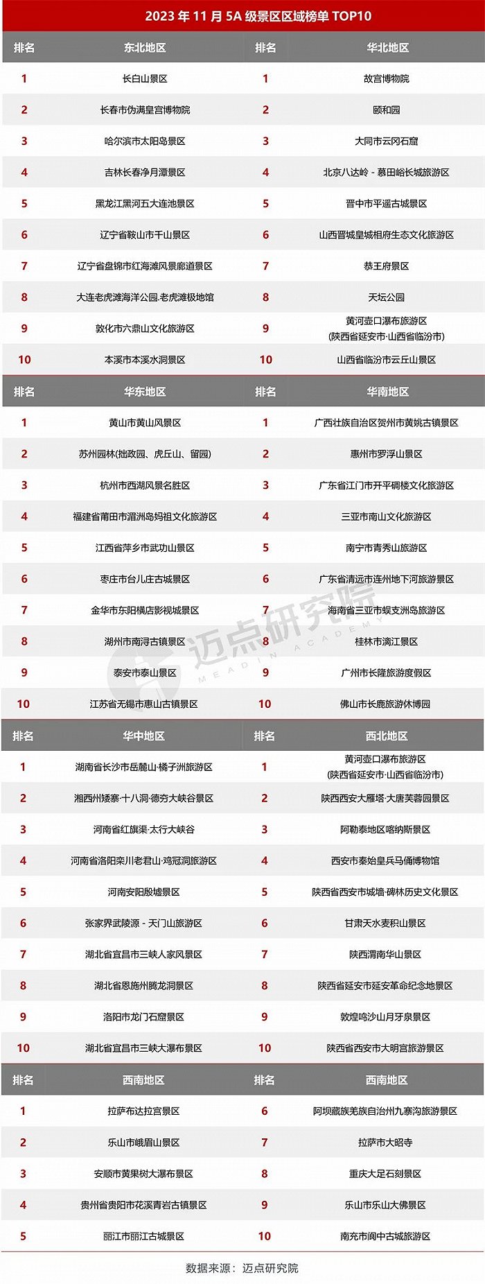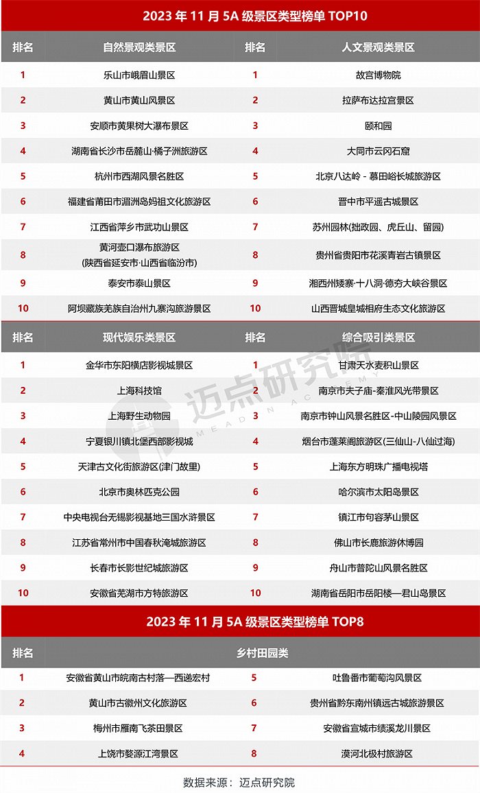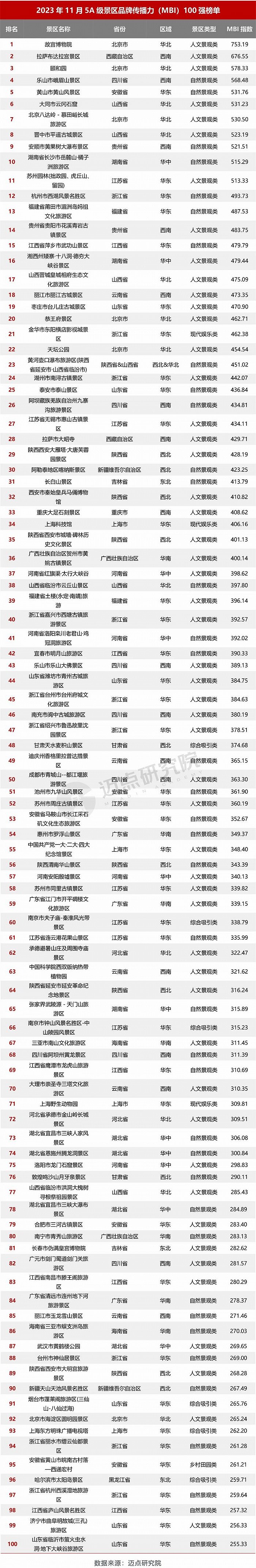 以下是迈点研究院独家发布“2023年11月5A级景区品牌传播力(MBI)100强榜单”。10月,故宫博物院、拉萨布达拉宫景区、颐和园、乐山市峨眉山景区、黄山市黄山风景区、大同市云冈石窟、北京八达岭-慕田峪长城旅游区、晋中市平遥古城景区、安顺市黄果树大瀑布景区、湖南省长沙市岳麓山·橘子洲旅游区跻身榜单前十。