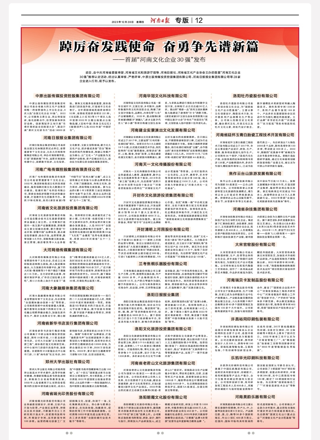 近日,由中共河南省委宣传部、河南省文化和旅游厅指导,河南日报社、河南省文化产业协会主办的首届“河南文化企业30强”推荐认定活动,经过认真审核、严格评审,中原出版传媒投资控股集团有限公司、河南日报报业集团有限公司等28家企业进入行列,现予以发布。