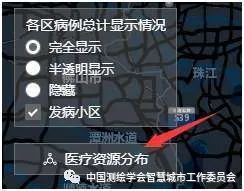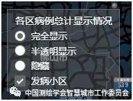 左上角图层控制可以对行政区发病分层设色图和发病小区点进行显示/隐藏控制,便于查看基础底图,确认周边环境;