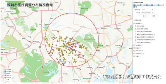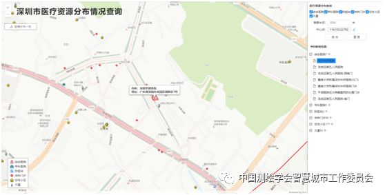 深圳市医疗资源分布查询,展示所选中心位置附近的医疗资源分布;